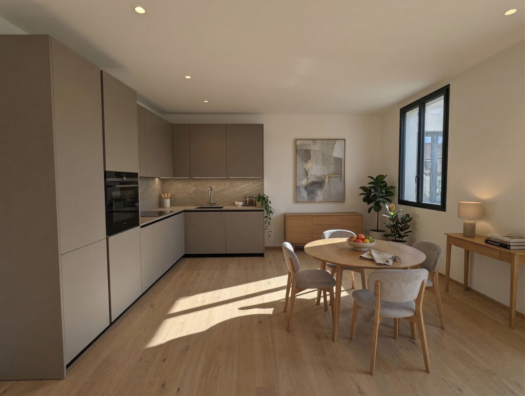 - Living room with dining area and open kitchen